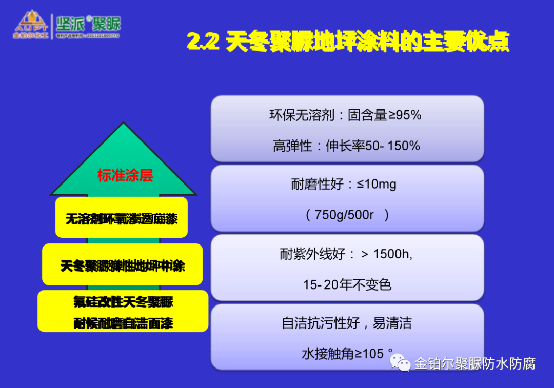 氟硅改性天冬聚脲被稱為第四代聚脲,具有環保無溶劑、超耐磨、超耐紫外線、高彈性、自潔抗污等功能,如果做為地坪材料使用,其使用壽命可以超過二十年以上,是當前綜合性能優異的地坪材料之一,也是當前頗具發展潛力的地坪材料。產品已成功應用于水上樂園、工業地坪、冷庫地坪、養殖場地坪、室外地坪、地下停車場、艦艇甲板等諸多應用領域。